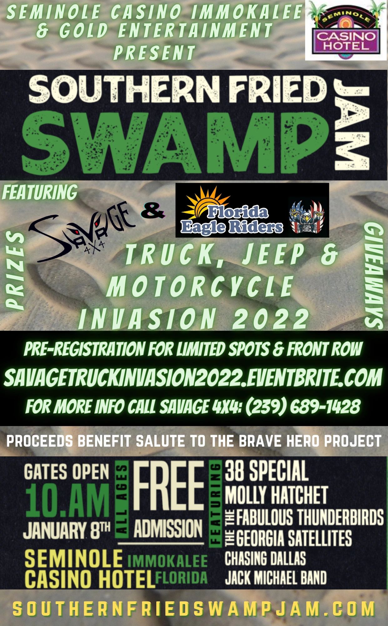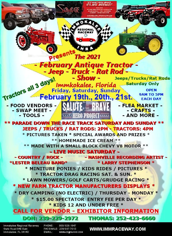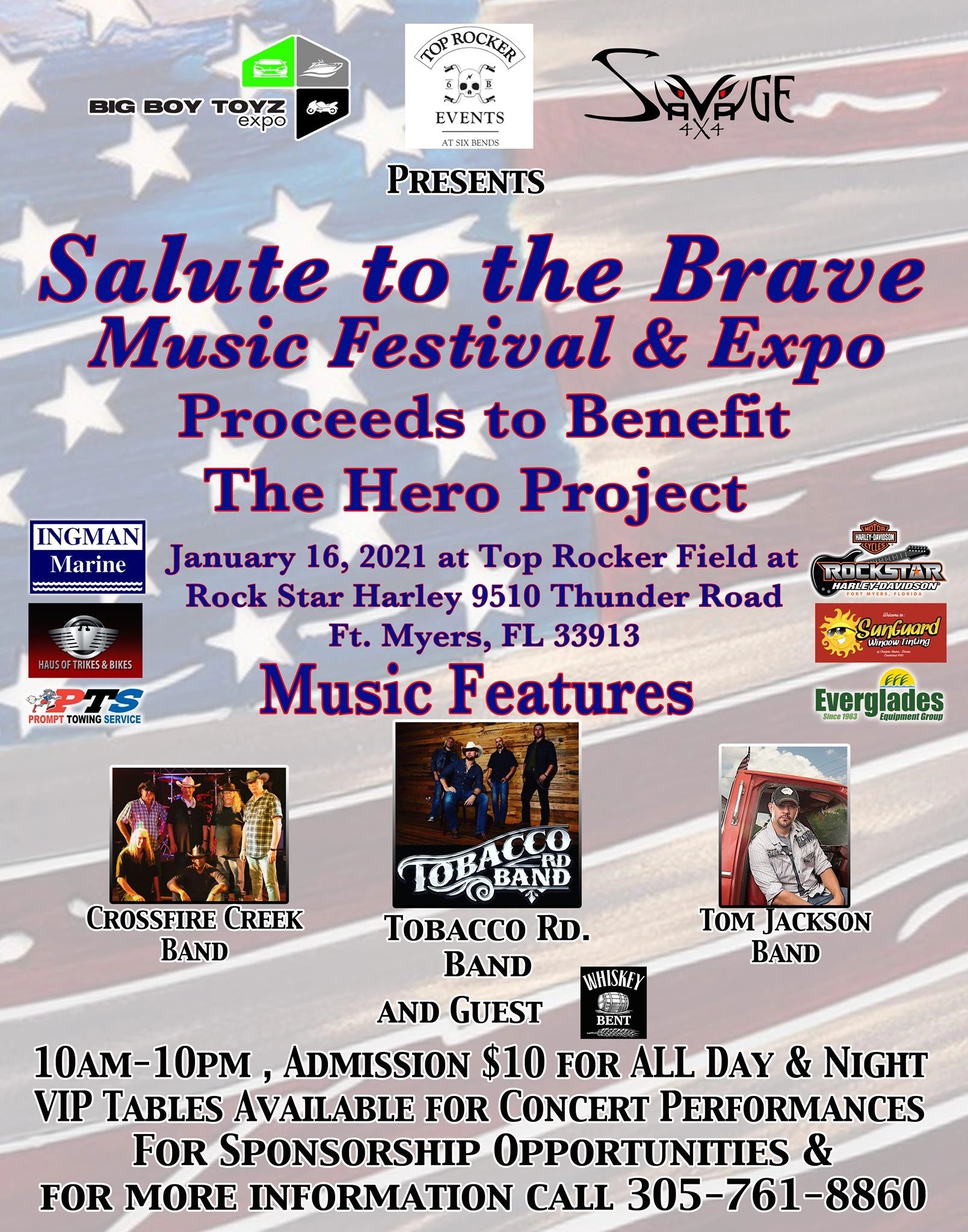 Get ready for a full day of Vendors and Music, all for the Salute to the Brave "Hero Project"!! Gates open at 10am!! Come see Boats, Motorcycles, ATVs, RVs, Exotic cars, Tractors, Trucks, Jeeps, and so much more!! That's not all, the huge Music line up gets cranking at 4pm and will take us into the late evening!!!